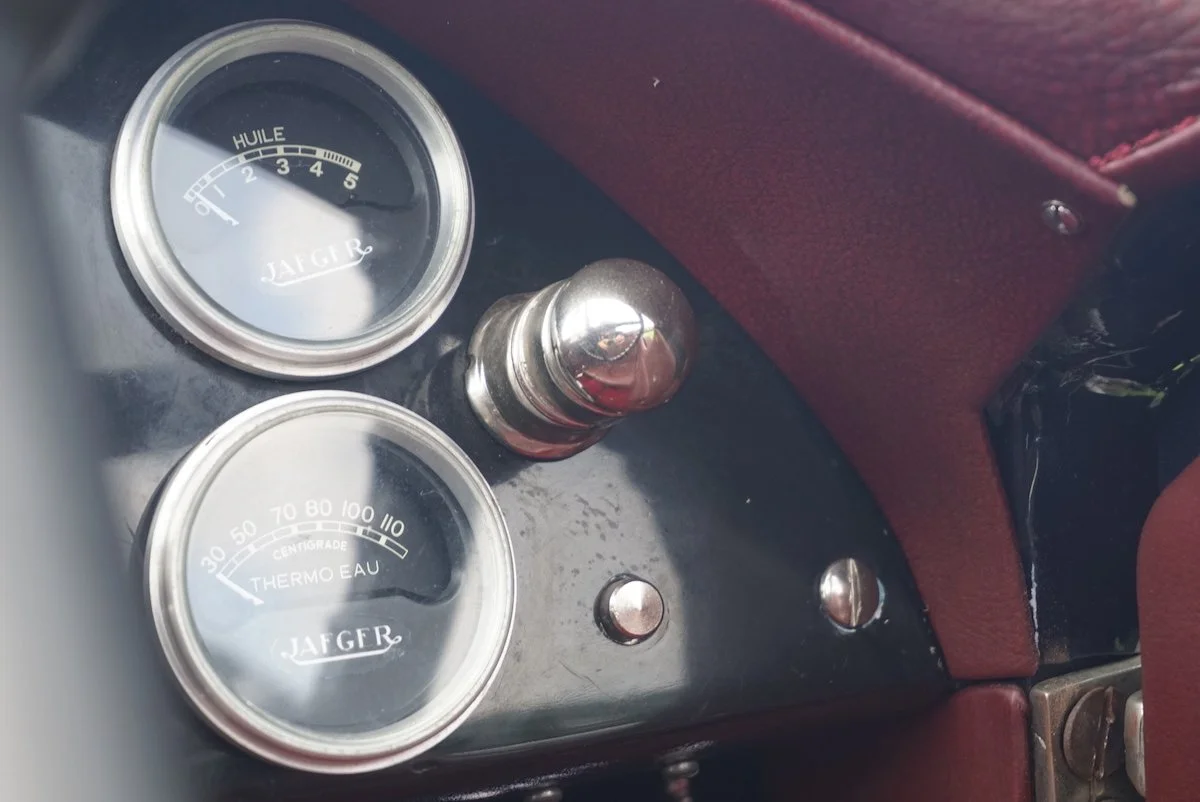 The car features aluminum bodywork finished in dark blue with burgundy fenders and is powered by an Alfa Romeo 2.6-liter DOHC inline-six that breathes through twin carburetors. Additional features include a ladder frame with leaf-sprung solid axles at each end, a five-speed manual transmission, power-assisted hydraulic finned drum brakes, 18” wire wheels, and red leather upholstery over seating for two. Service in May 2022 included the replacement of the fuel pump and battery as well as a carburetor adjustment and repair of a radiator leak.