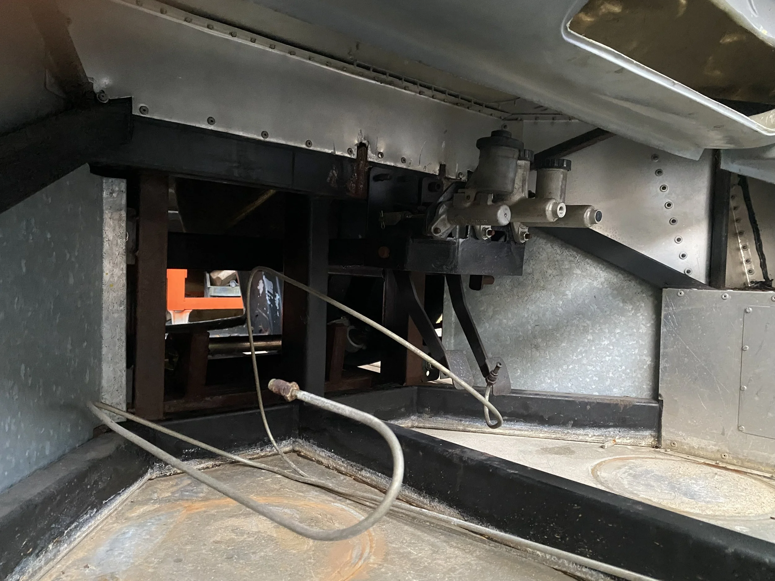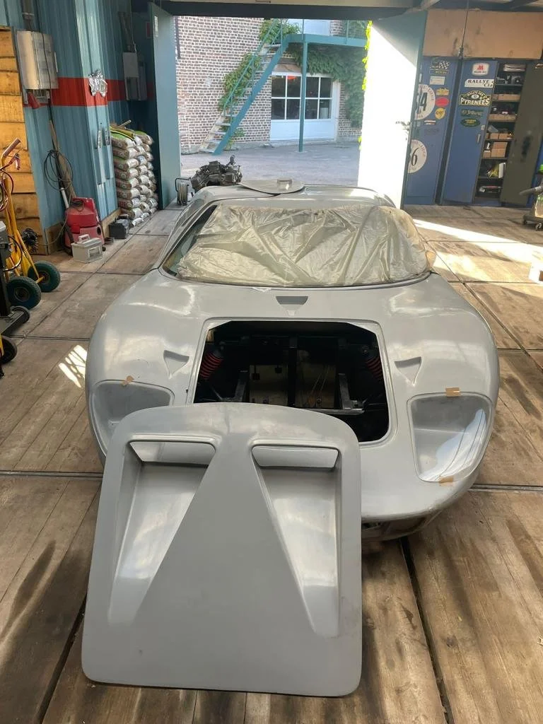 Complete chassis and bodywork including aluminium halibrand wheels with central knock-offs.Excellent condition of chassis and bodywork. Comes with a V8 engine (origin unknown, specifications unknown), Audi gearbox, adjustable suspensions, windows (side, rear and light covers), 2 black faux leather seats with GT40 lettering, pedal box, steering box, leather steering wheel, set of Smith gauges, front brake discs, rear drum brakes, gear lever on right side, fuel tank, exhaust system, etc..A good solid project car that still needs to be finished.