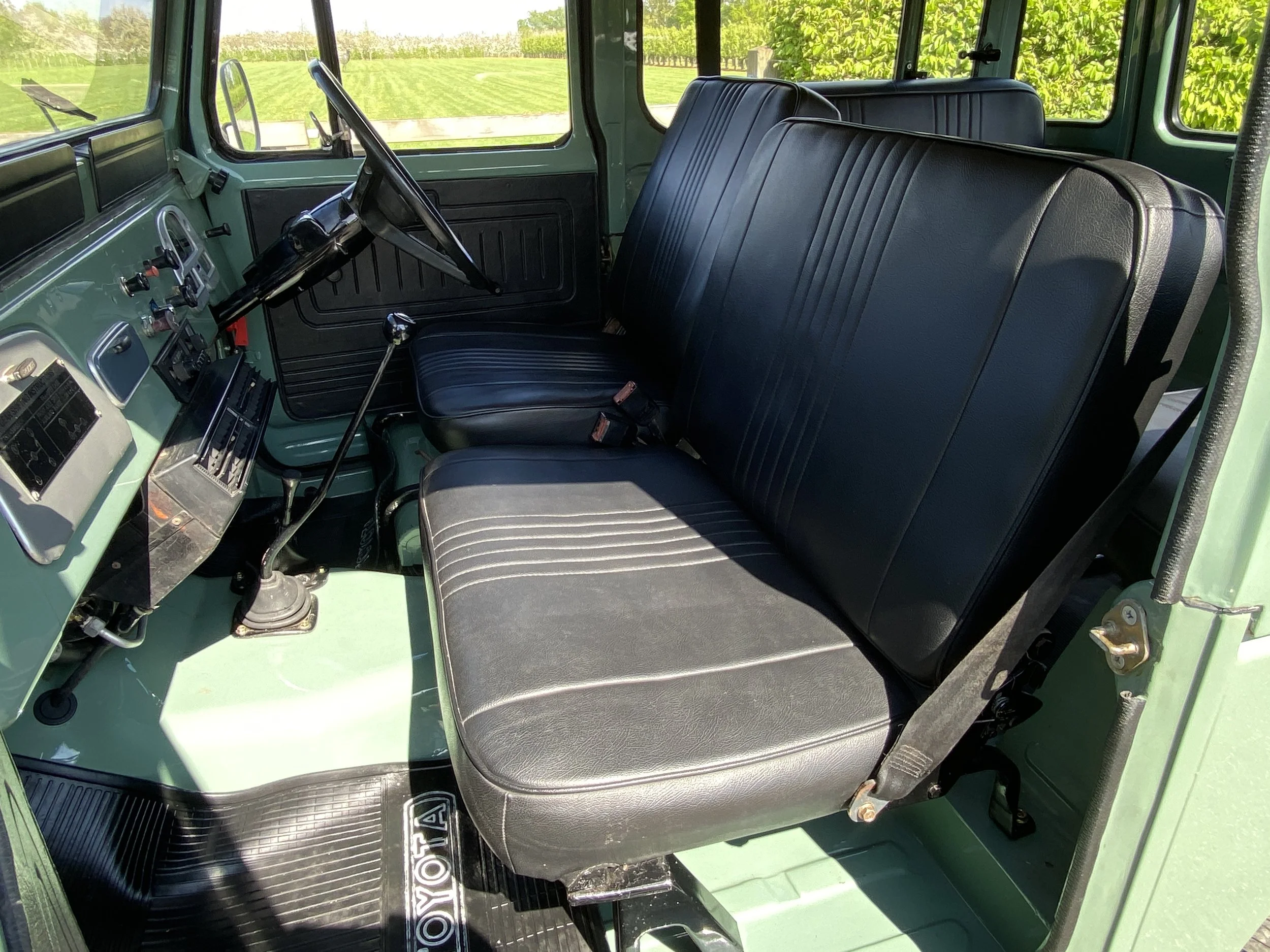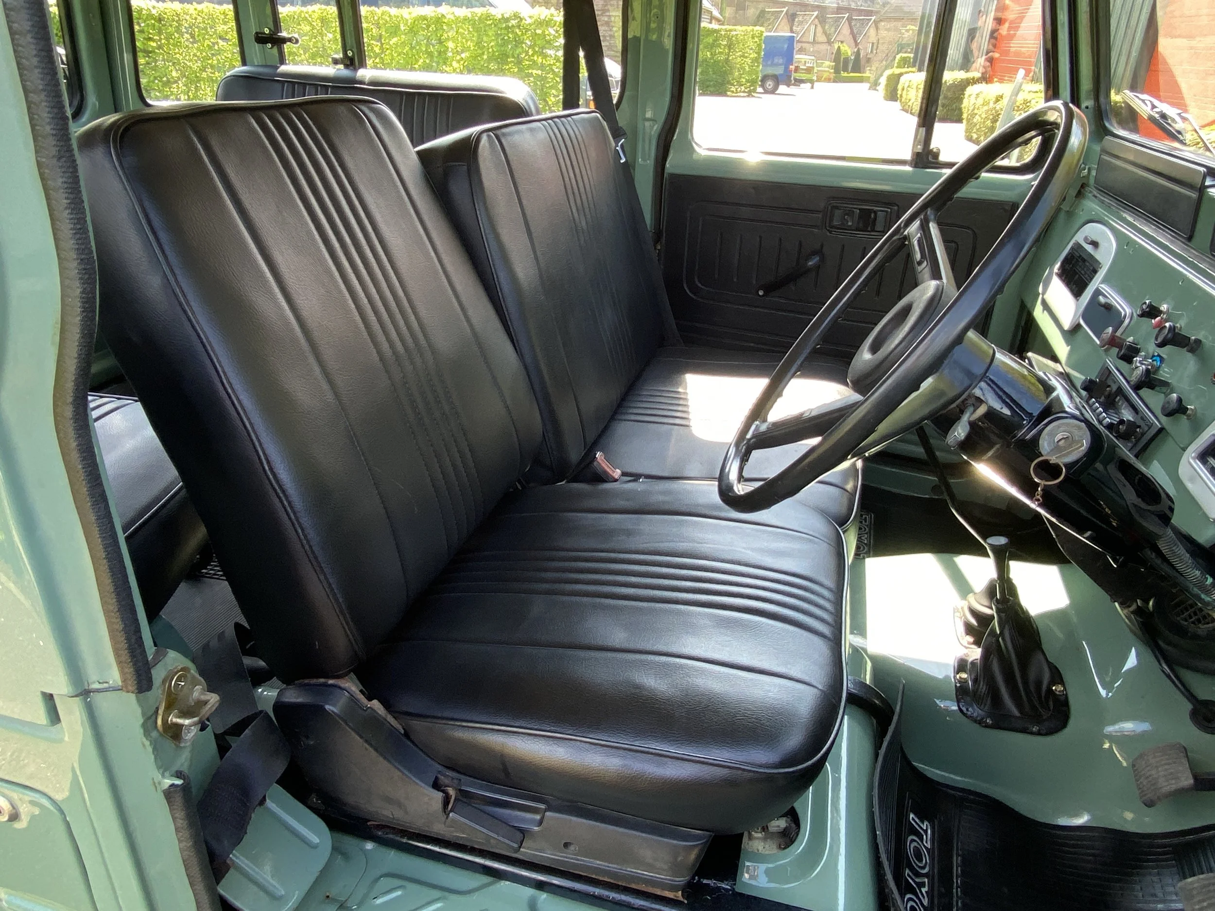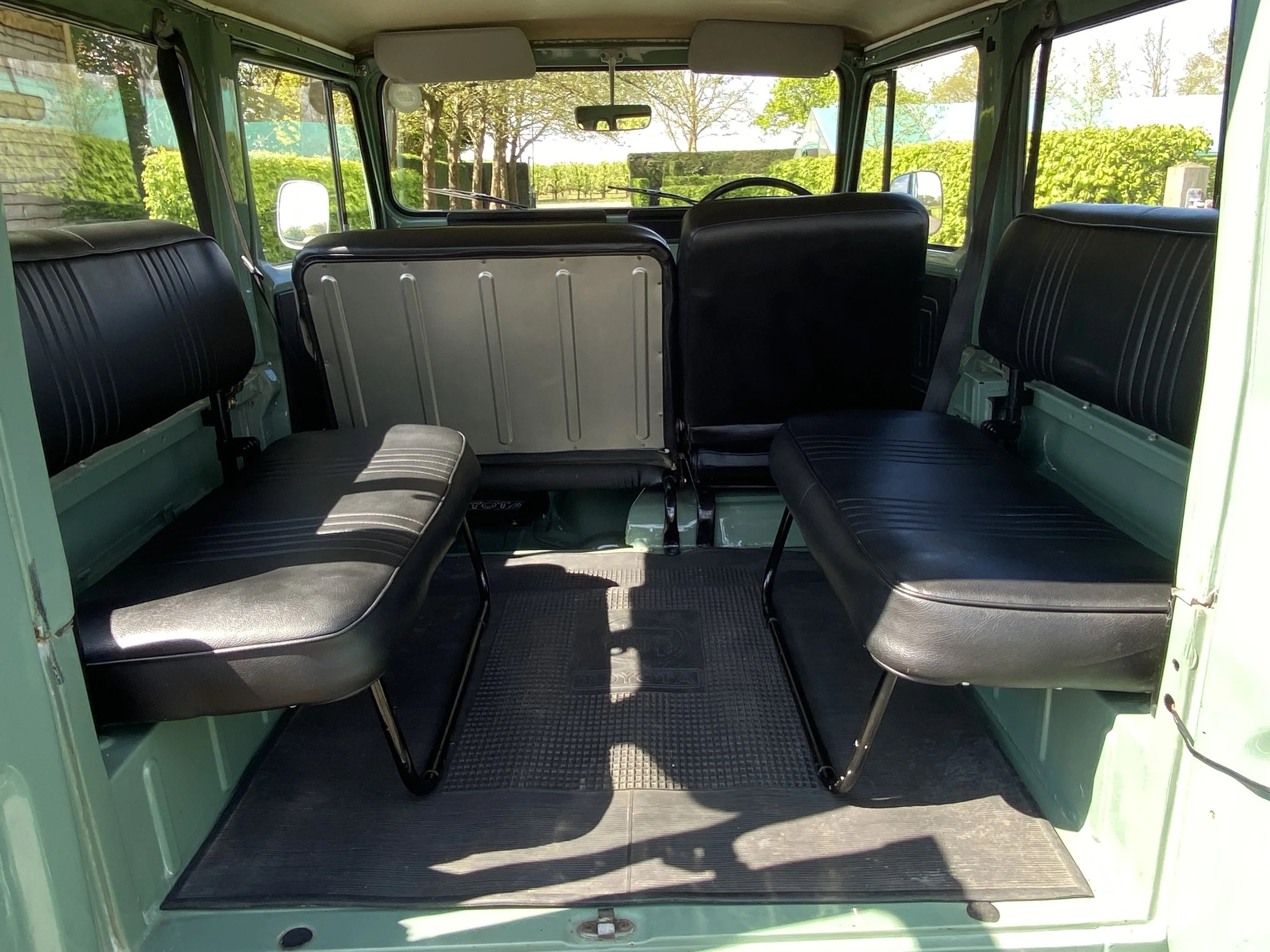 On this set of white wheels, you will find some brand new off-road tyres. On the inside of the FJ you will find place for 6 passengers and the driver. This interior was kept as original as possible and futures some black vinyl seats. All in very good condition with only some minor traces of use.
