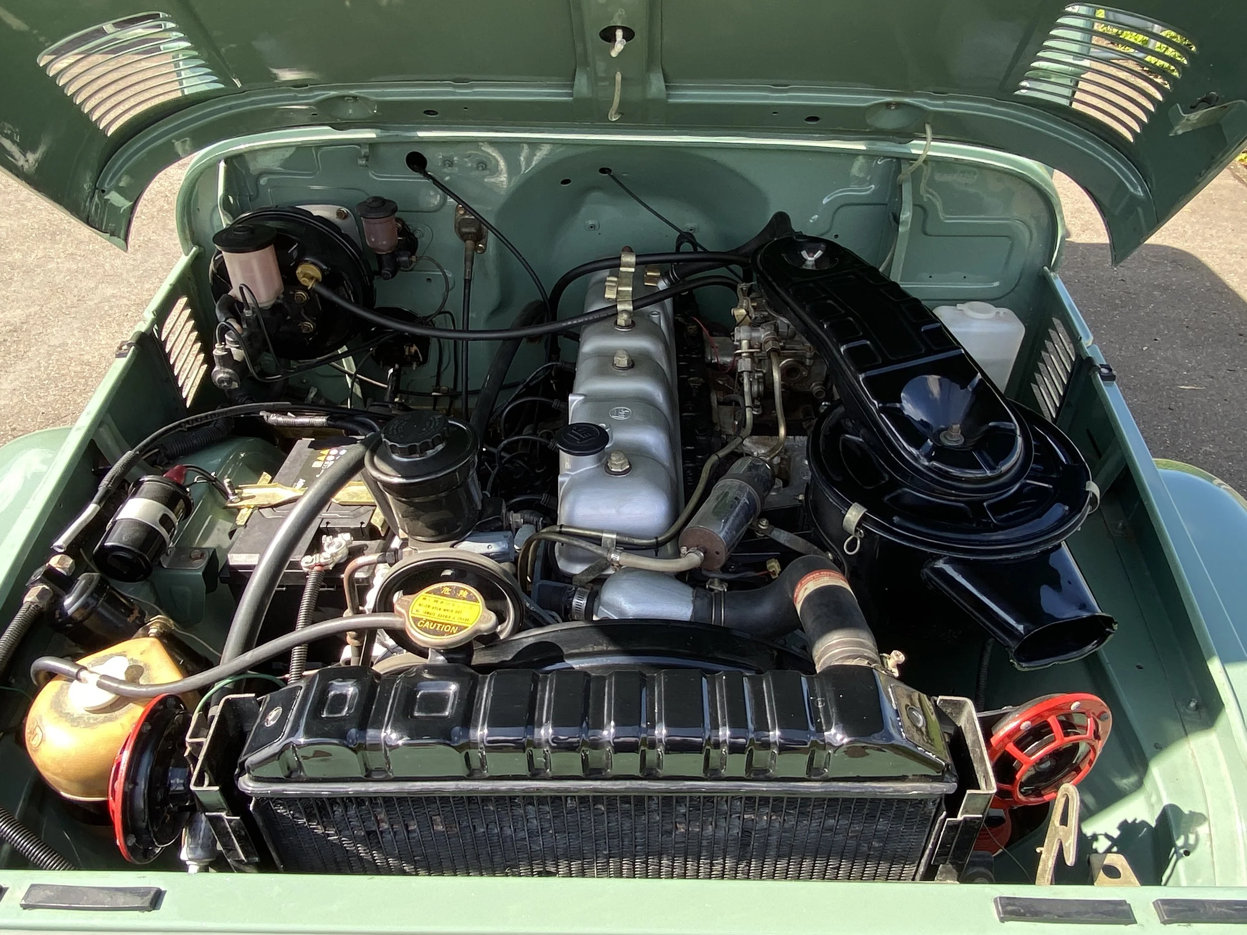 Moteur 3.8L - 6 cylindres avec boîte de vitesses à 3 rapports. Ce Landcruiser a été maintenu aussi original que possible et possède les équipements suivants : Airco, direction assistée, système de freinage assisté, feux de route etc... La couleur vert clair a été un très bon choix pour cette voiture et se marie très bien avec le toit blanc et les jantes en acier assorties.