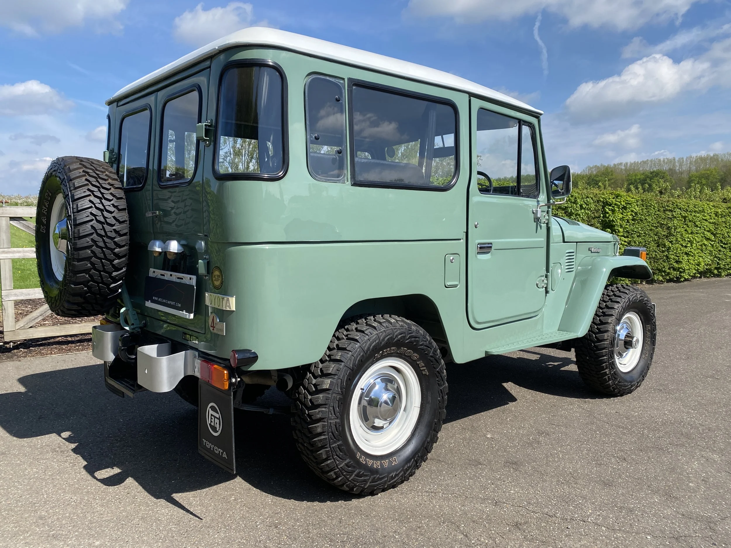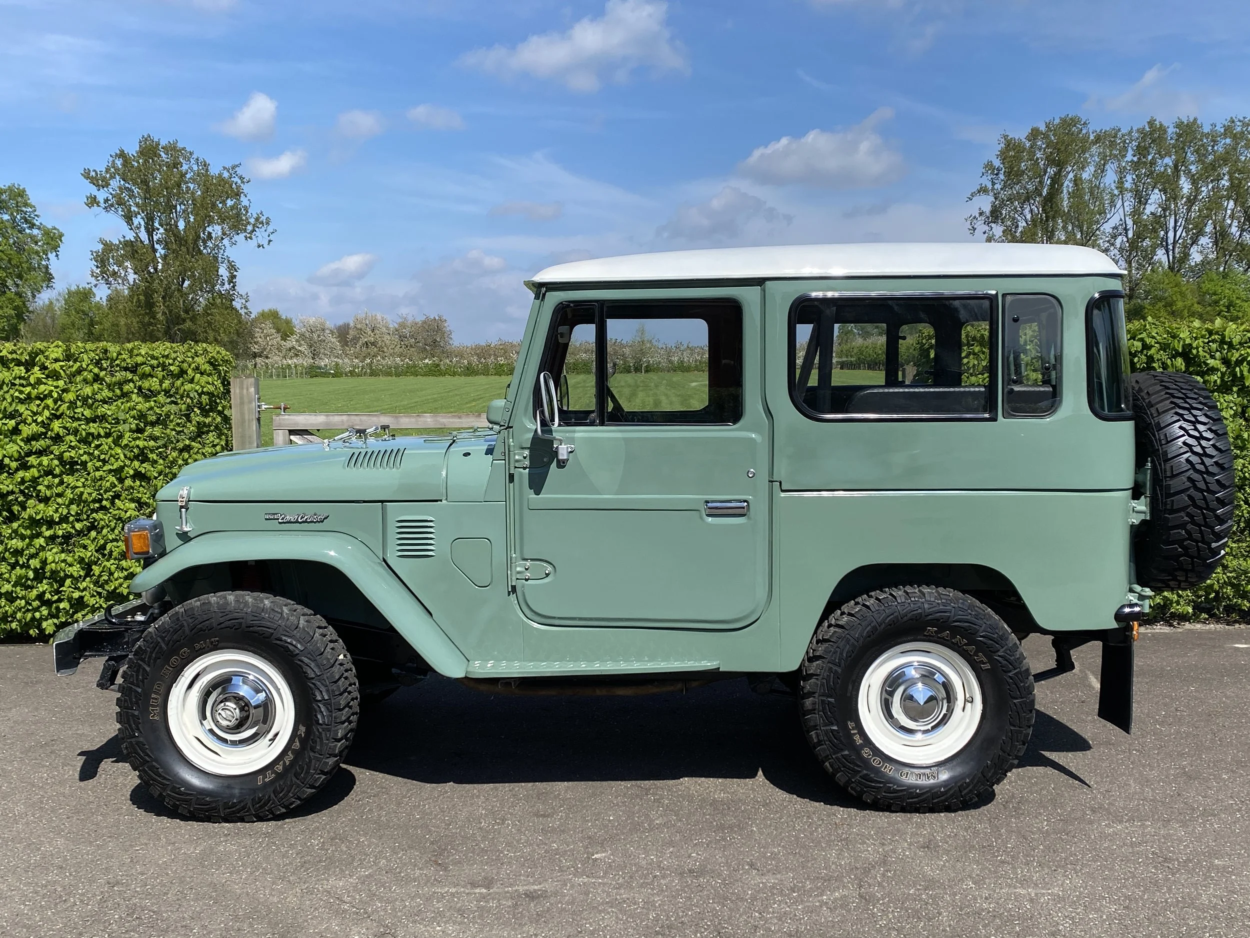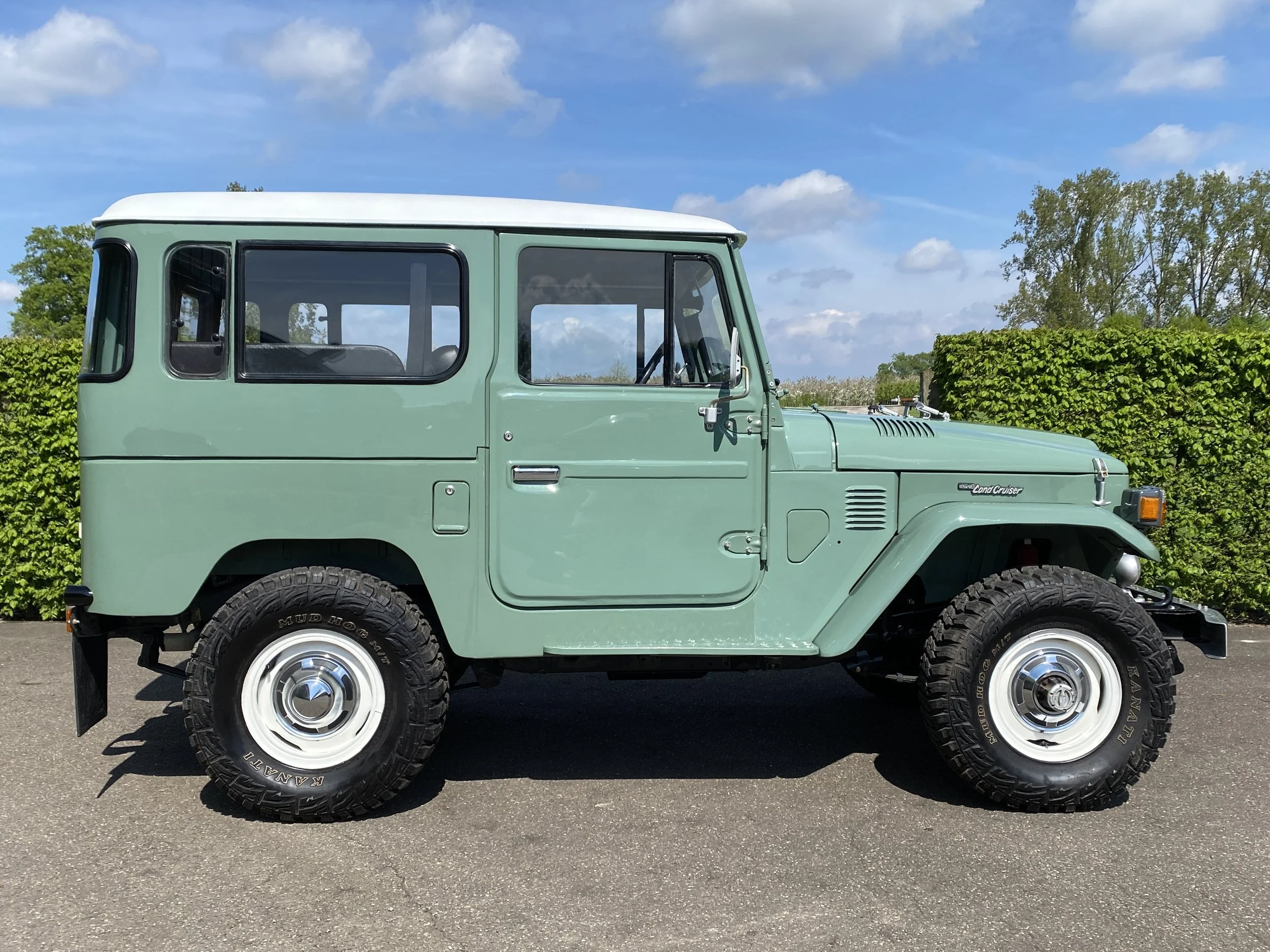3.8L – 6 cilinder engine with 3 speed gearbox. This Landcruiser has been maintained as original as possible and futures the following equippement : Airco, power steering, assisted brake system, driving light’s etc… The light green color has been a great choice for this car and looks the part with the white roof top and matching steel wheels.