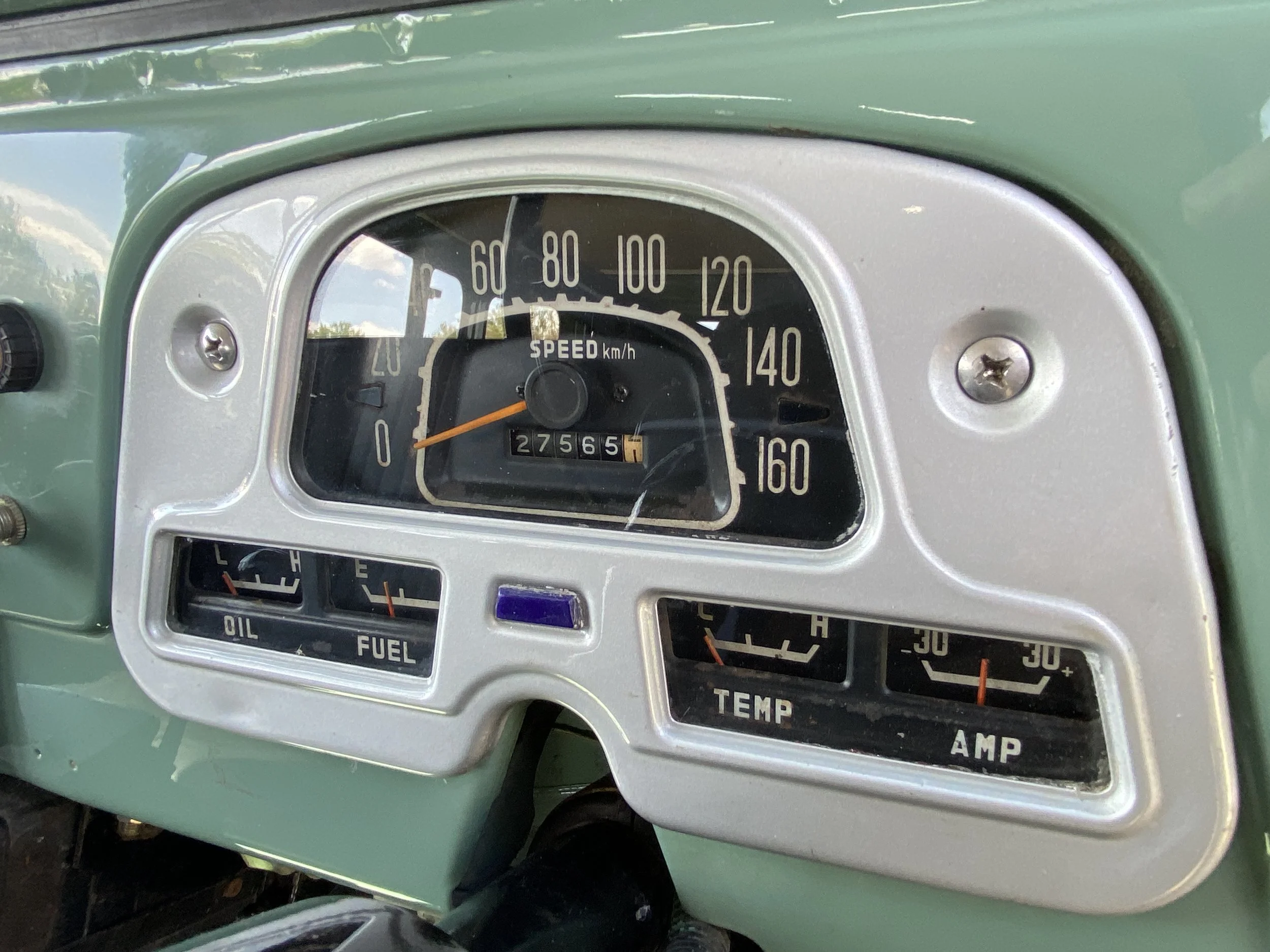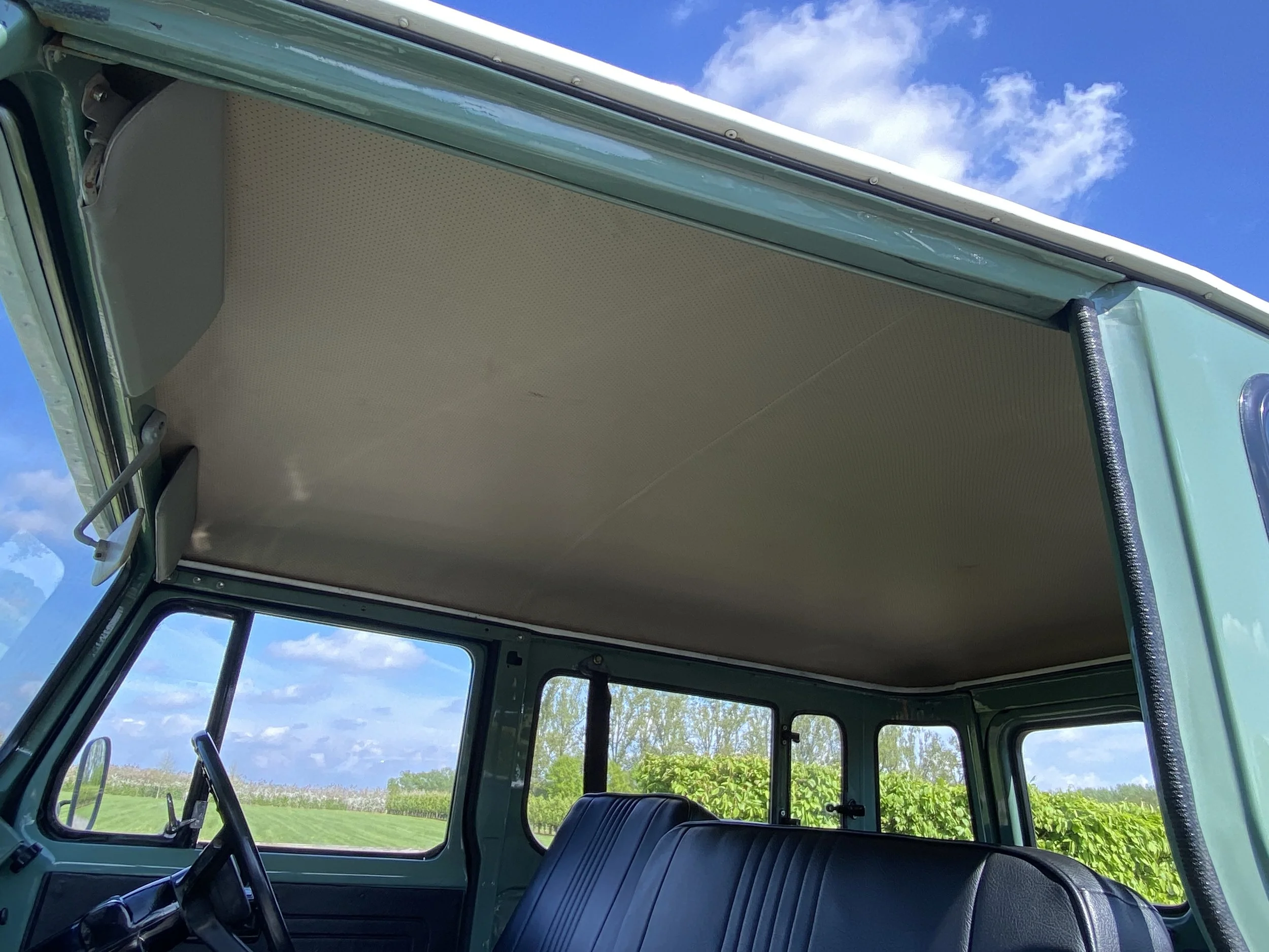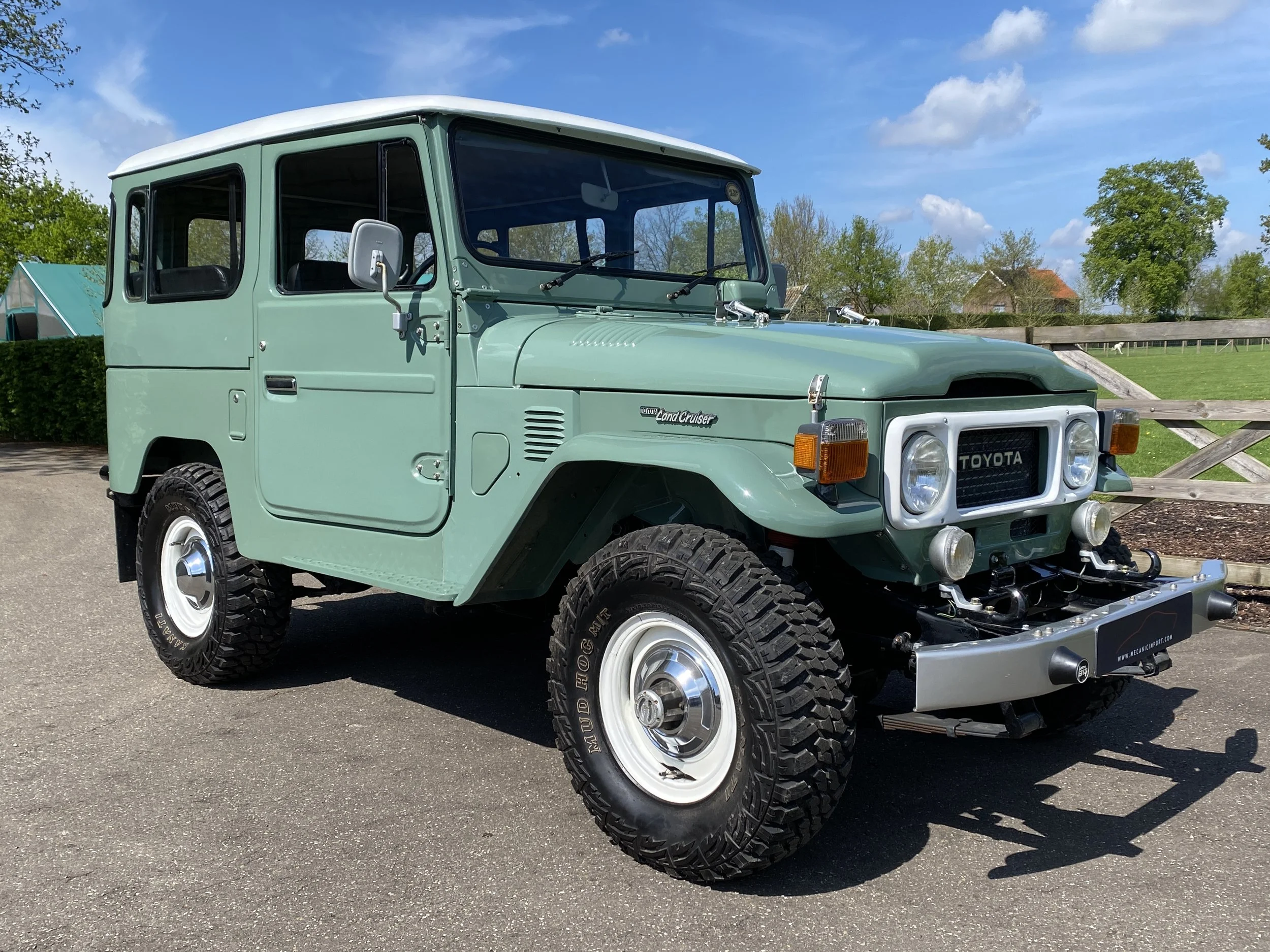 3.8L – 6 cilinder engine with 3 speed gearbox. This Landcruiser has been maintained as original as possible and futures the following equippement : Airco, power steering, assisted brake system, driving light’s etc… The light green color has been a great choice for this car and looks the part with the white roof top and matching steel wheels.